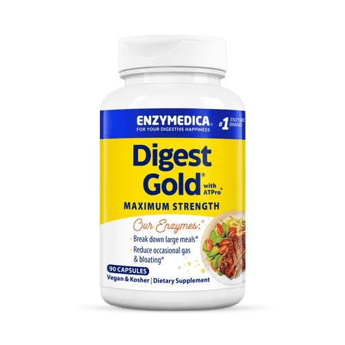 Digest Gold® delivers a proprietary enzyme blend that can break down protein, fiber, fat, carbs and lactose (the sugar in dairy). Each capsule of Digest Gold® can digest up to: